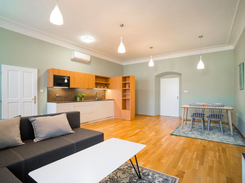 Disponuje obývacím pokojem s kuchyňským a jídelním koutem, plně vybavenou kuchyňskou linkou s lednicí, indukcí, mikrovlnou troubou a myčkou nádobí, rozkládací sedací soupravou, TV, klimatizací, dvěma ložnicemi a dvěma koupelnami. Jedna ložnice je tvořena manželskou postelí a šatnou, druhá ložnice s manželskou postelí je spojena s koupelnou s vanou. K vybavení této koupelny patří dále WC a bidet. Druhá koupelna tohoto apartmánu je vybavena sprchou a WC. Vhodné pro čtyři dospělé osoby s možností dvou přistýlek v obývacím pokoji (rozkládací sedačka).