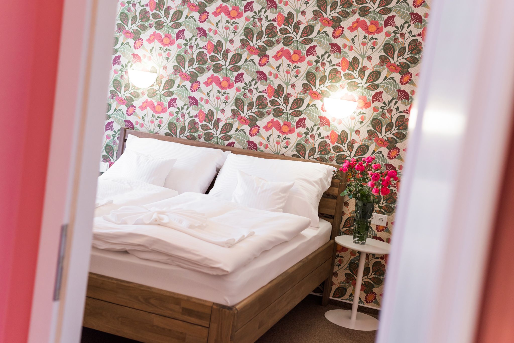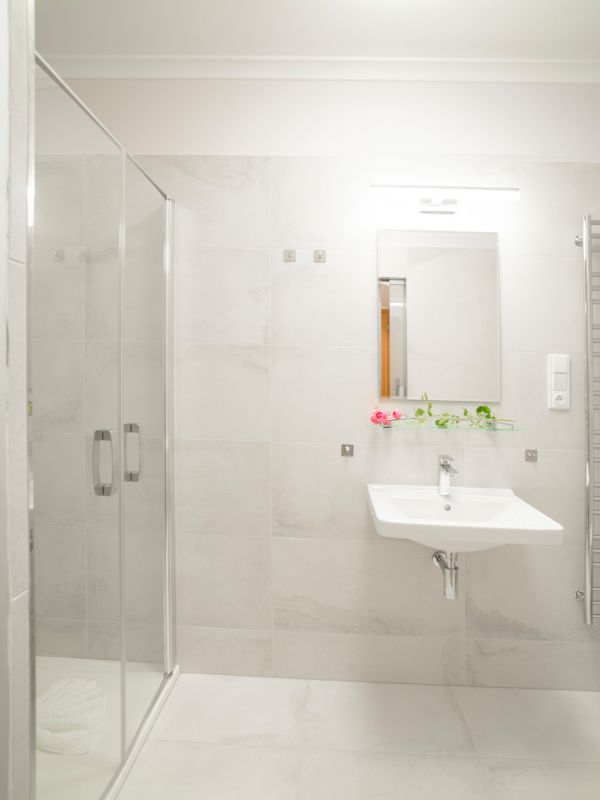 The pink room offers you a living room with a kitchen and dining area, a fully equipped kitchen with a fridge, induction cooktop, microwave oven, dishwasher, a sofa set, and a TV, a bathroom with a shower and toilet, and a bedroom with a double bed suitable for two adults, with the possibility of two extra beds in the living room (folding sofa).