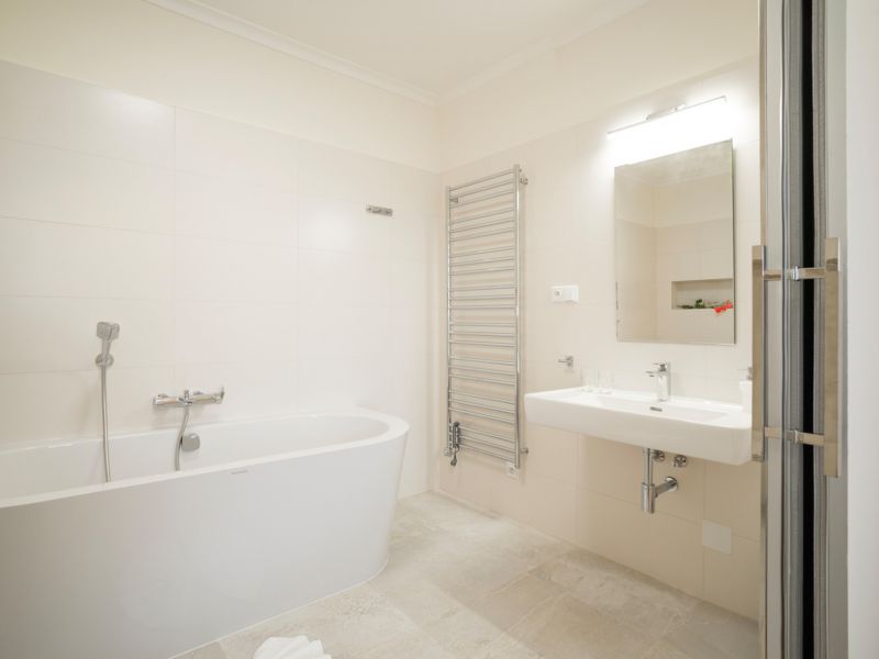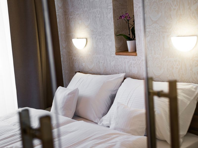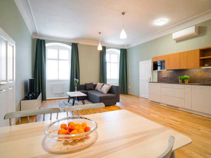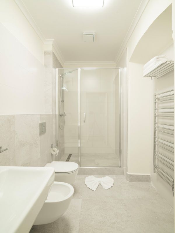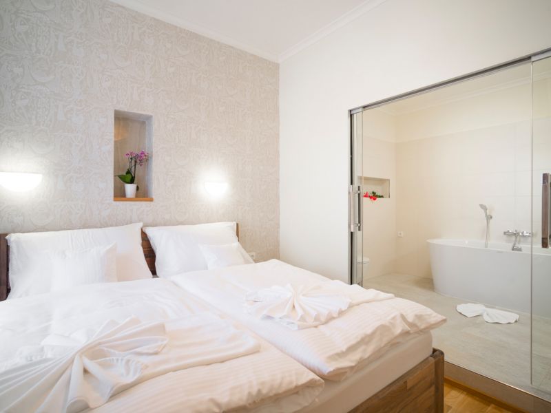 The apartment offers two bedrooms, two bathrooms, a living room with a kitchen and dining area, a completely furnished and equipped kitchen with a fridge, induction cooktop, microwave oven, and dishwasher, a sofa bed, TV, and air conditioning. A double bed and a wardrobe can be found in one bedroom, and a bathroom with a bathtub is accessible from the second bedroom, which also has a double bed. It also included a toilet and a bidet in the bathroom. There is a shower and a toilet in the apartment's second bathroom, suitable for four people, with the potential for two more beds (a folding sofa) in the living area.